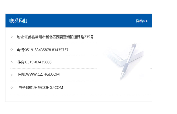 地址:常州市新北區友邦商務大廈1幢16、17層  電話:0519-85101652  傳真:0519-85112595  郵編:213022  網址:www.cz-jiayue_cn.cqxdsp.com  郵箱:xiajifengaa@163.com